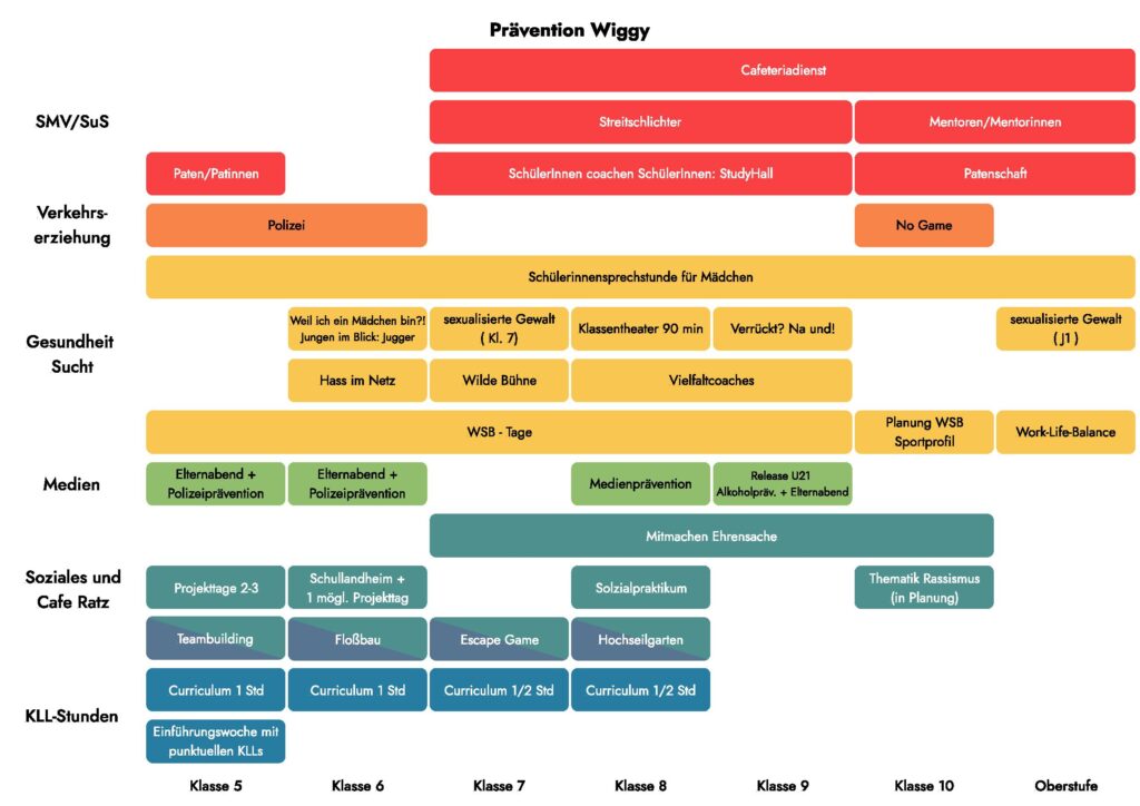 Zusatz: Unser Präventionscurriculum bietet eine beispielhafte Übersicht der im Verlauf eines Schuljahrs stattfindenden Projekte und Maßnahmen. Die Auflistung dient der Orientierung und wird regelmäßig an aktuelle Entwicklungen und Bedarfe angepasst.